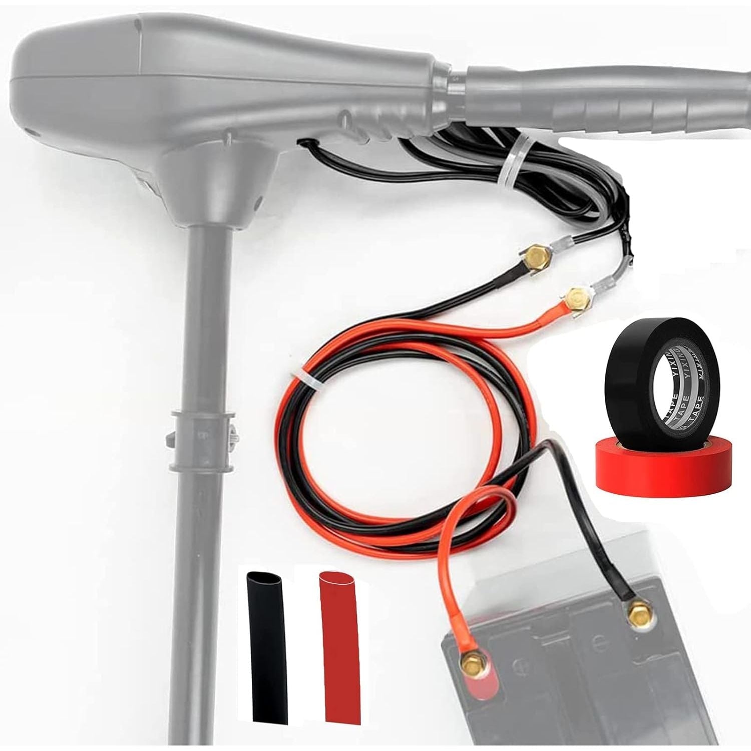 - 【Come With】10 feet trolling motor battery extension cable Red & Black, Connecting hardware ring terminals (already crimped), copper screws and nuts, 2 safe electrical tape, 2 free heat shrink tube.