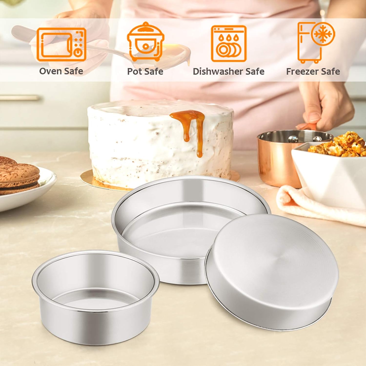 • DURABLE - Layer cake pans are constructed by premium-grade and heavy gauge stainless steel to avoid deformation, Rust resistant and sturdy for a long-lasting service life, Leak proof, Not as the springform, Easy to clean up and dishwasher safe, Pressure cooker safe