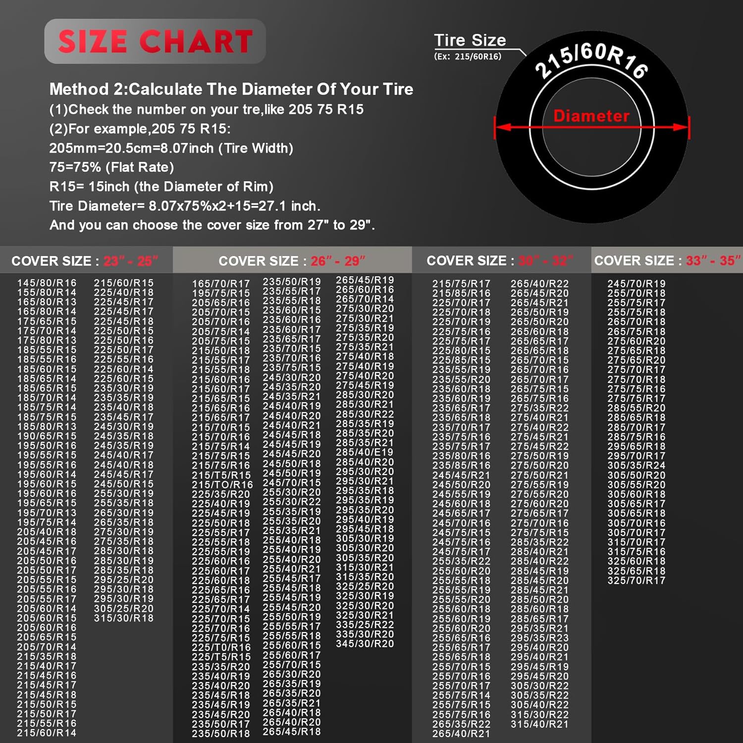 • 【Wind Resistant Tire Cover】Elasticized back hem and hook design for a secure fit. The cord keeps the tire cover stay on the wheel even on windy days. Easy to install and remove.