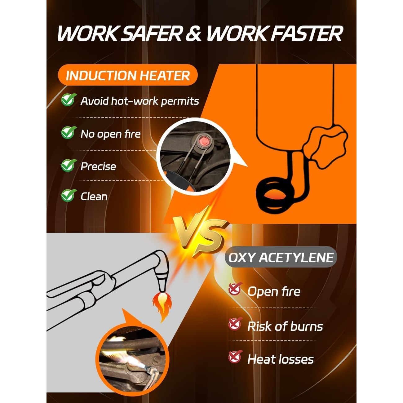 - [High Working Efficiency] This induction heater uses electromagnetic fields for metal heating. It beats the oxy-acetylene system, heating up in 30 seconds. No open flame means a safer work environment, boosting productivity.