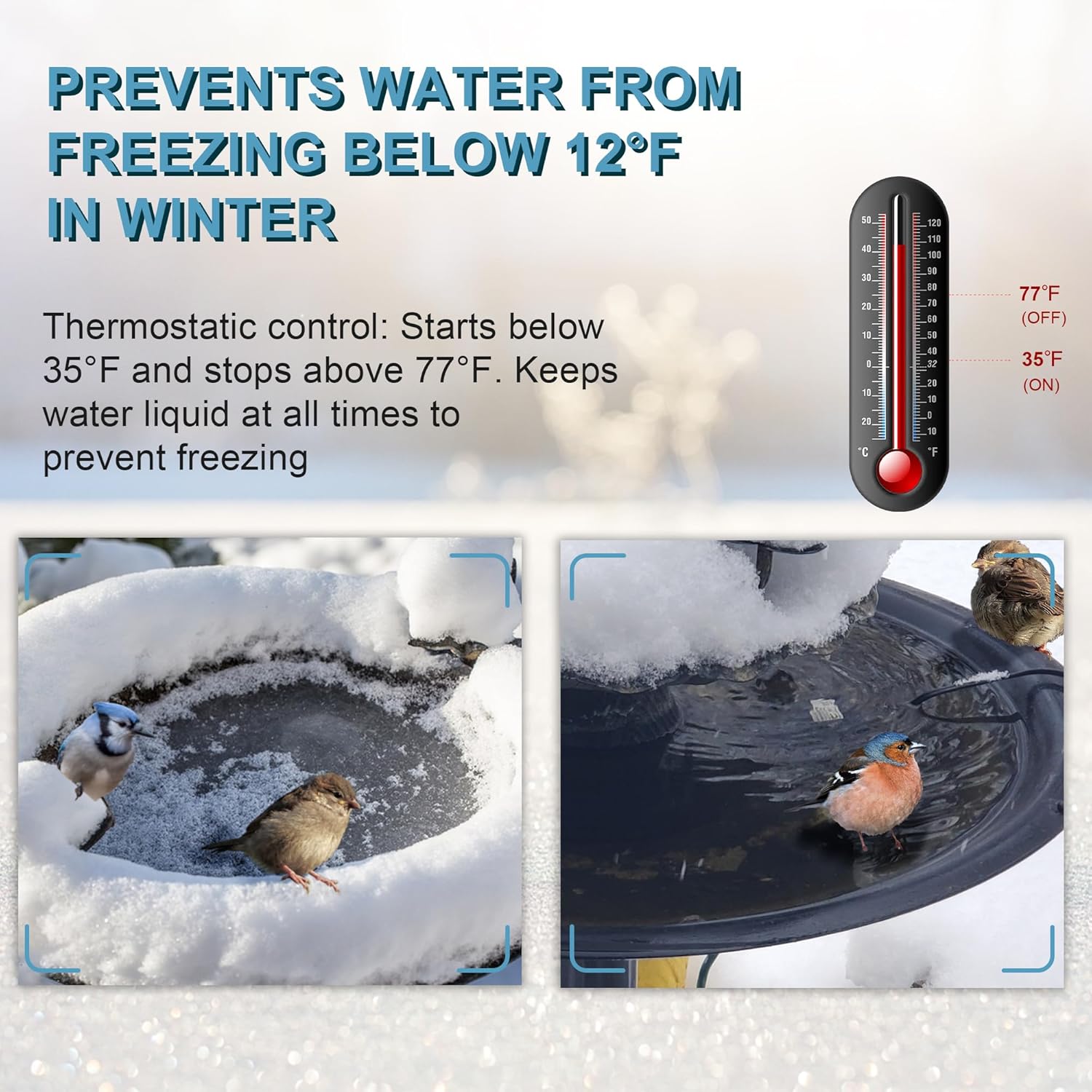• Automatic Thermostat Controller: The bird bath de-icer automatically turns on when the ambient temperature falls below 35°F (2°C). When the sensor in the head senses that the ambient temperature is approaching 77°F (25°C), the power will automatically disconnect. Energy Savings