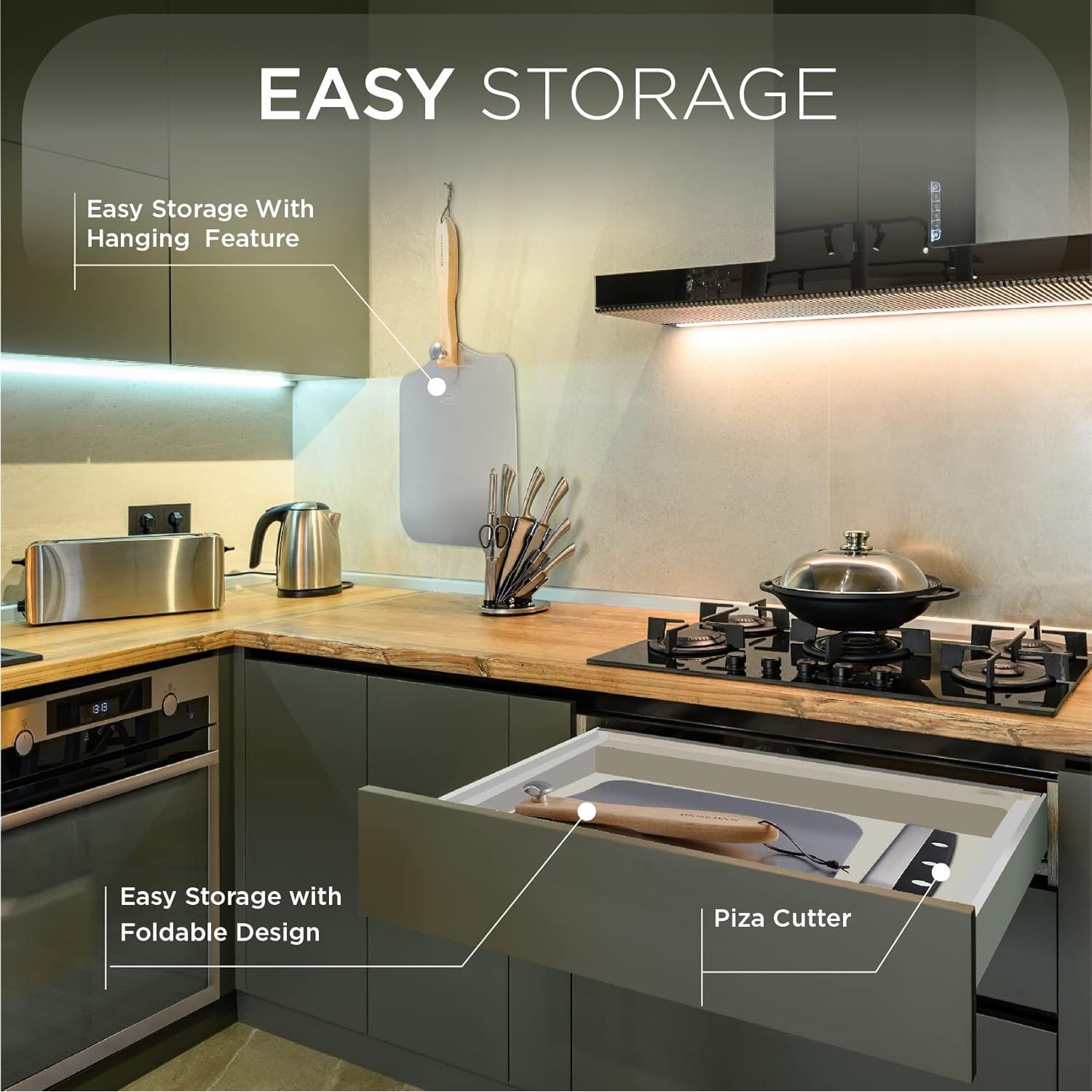 - DIFFERENCE IN DURABILITY AND STORAGE: This product is made only with top quality and highly durable food grade aluminum and all-natural oak wood handle. Long handle will keep your hand safe from heat. Foldable design and leather rope makes it easy to store in your kitchen.